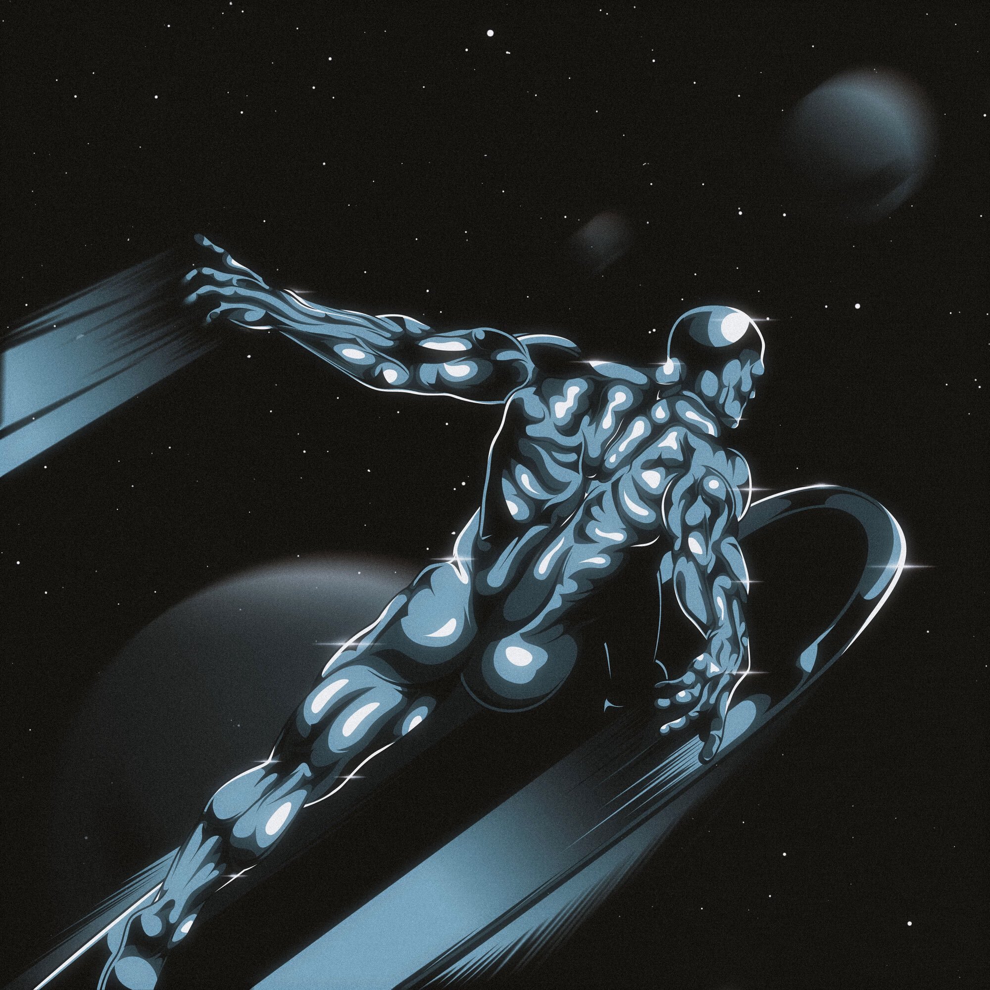 The Earth-M Surfer spends his time on Earth posing as a homeless man, sleeping more and more each day, detached from humanity. His rest is disturbed once an alien spacecraft of gigantic size enters Earth’s atmosphere with a view to land on the planet, causing panic, anarchy, and hysteria on a massive scale. Still untouched by this revelation, the Surfer finds himself investigated by three police officers, who find his appearance suspect. Before more can ensue, the spacecraft finally lands on Earth, in the middle of the city the Surfer resides in. Galactus is revealed to be the occupant – exclaiming himself all-powerful, he claims he wishes to guide mankind in a new, glorious era.