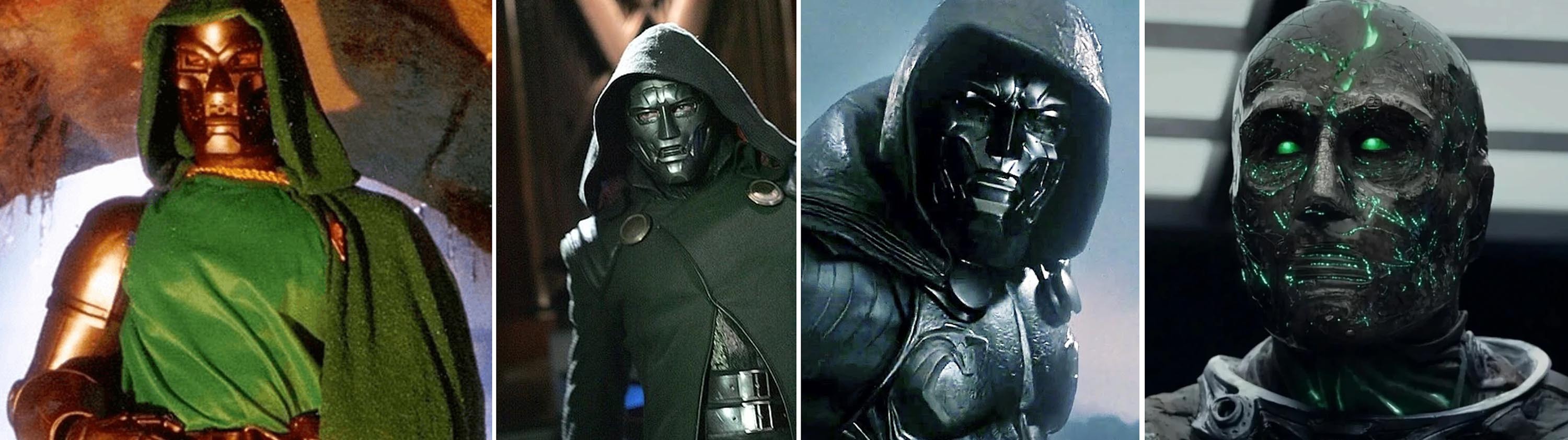 What kind of suit does Doom wear? | Classic Doom armor, which is bulletproof and has claws | His body turns to organic metal, with super strength, electric blasts and absorption, and possibly some minor telekinesis; he wears a classic metal Doom mask at the end | Same, but he looks normal again for a while, and eventually gets a suit that looks more like his comics look, and steals the Silver Surfer’s powers | He is physically fused with the suit that he wore for protection against the alien world, but the suit has no powers itself; he gains strength, energy blasts, and telekinesis (which is stronger on the other world) |